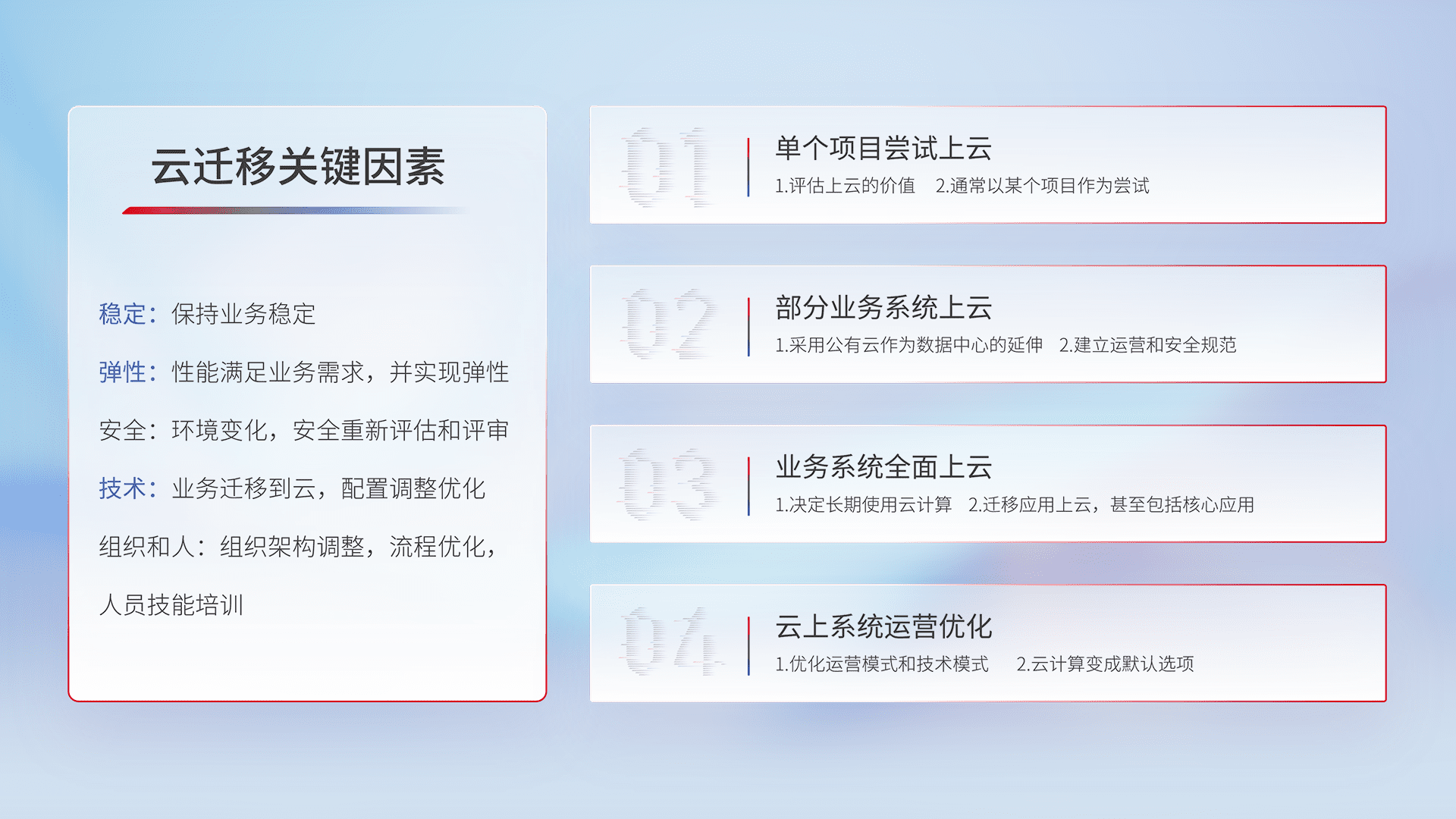 结合实际业务,,,从规划设计、、、云平台选型、、、、云原生改造、、、数据迁移、、集成交付,,,迁移全过程为客户识别最佳上云路径,,,,做好风险识别管理,,设计网络架构、、身份权限、、、安全审计合规、、、、操作审计、、、日志审计、、监控告警策略、、、多站点容灾设计等,,,,对云上基础设施进行整体规划,,,,提升IT治理水平,,,,以满足弹性、、高可用、、高性能的需求。。。