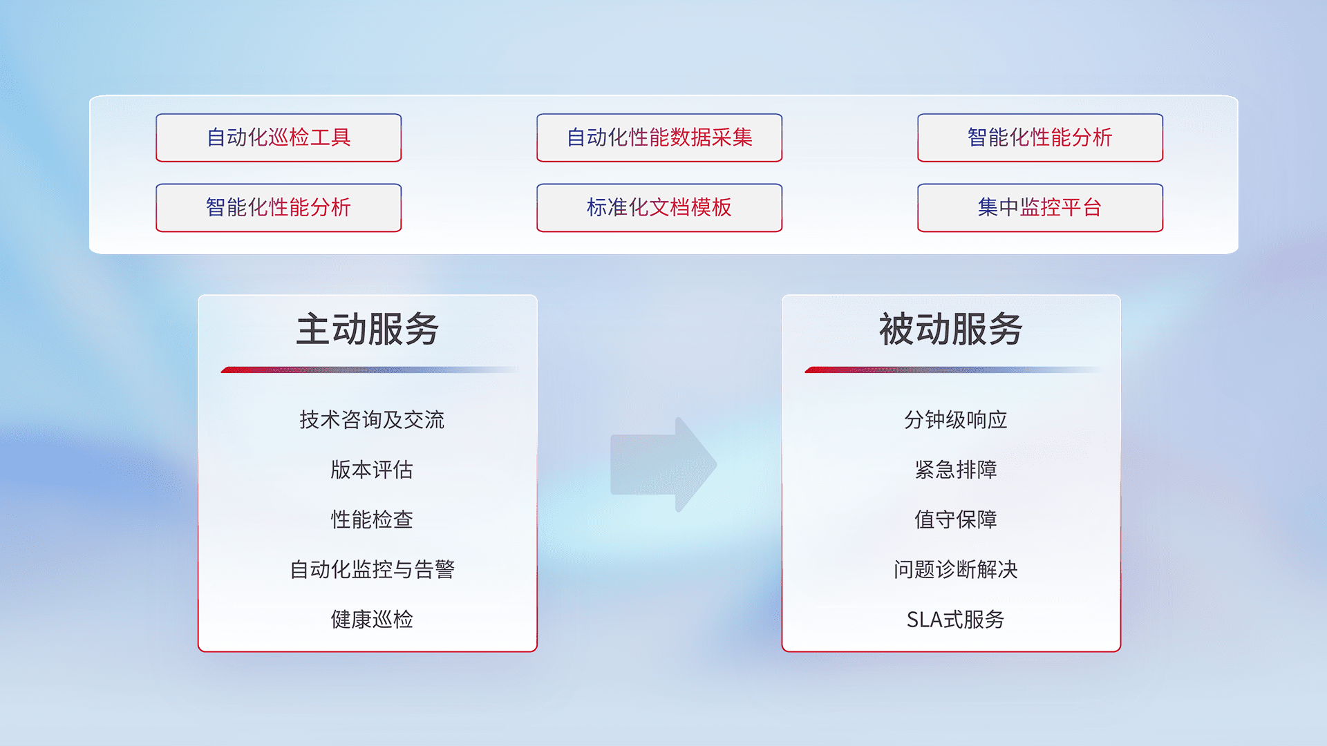 智能化工具和标准化文档,,保障服务质量,,提供主动服务(包含技术咨询、、、版本评估、、性能检查、、自动化监控与告警、、、、健康巡检)和被动服务包含(分钟级响应、、、、紧急排障、、、值守保障、、、、问题诊断解决、、、SLA服务)。。