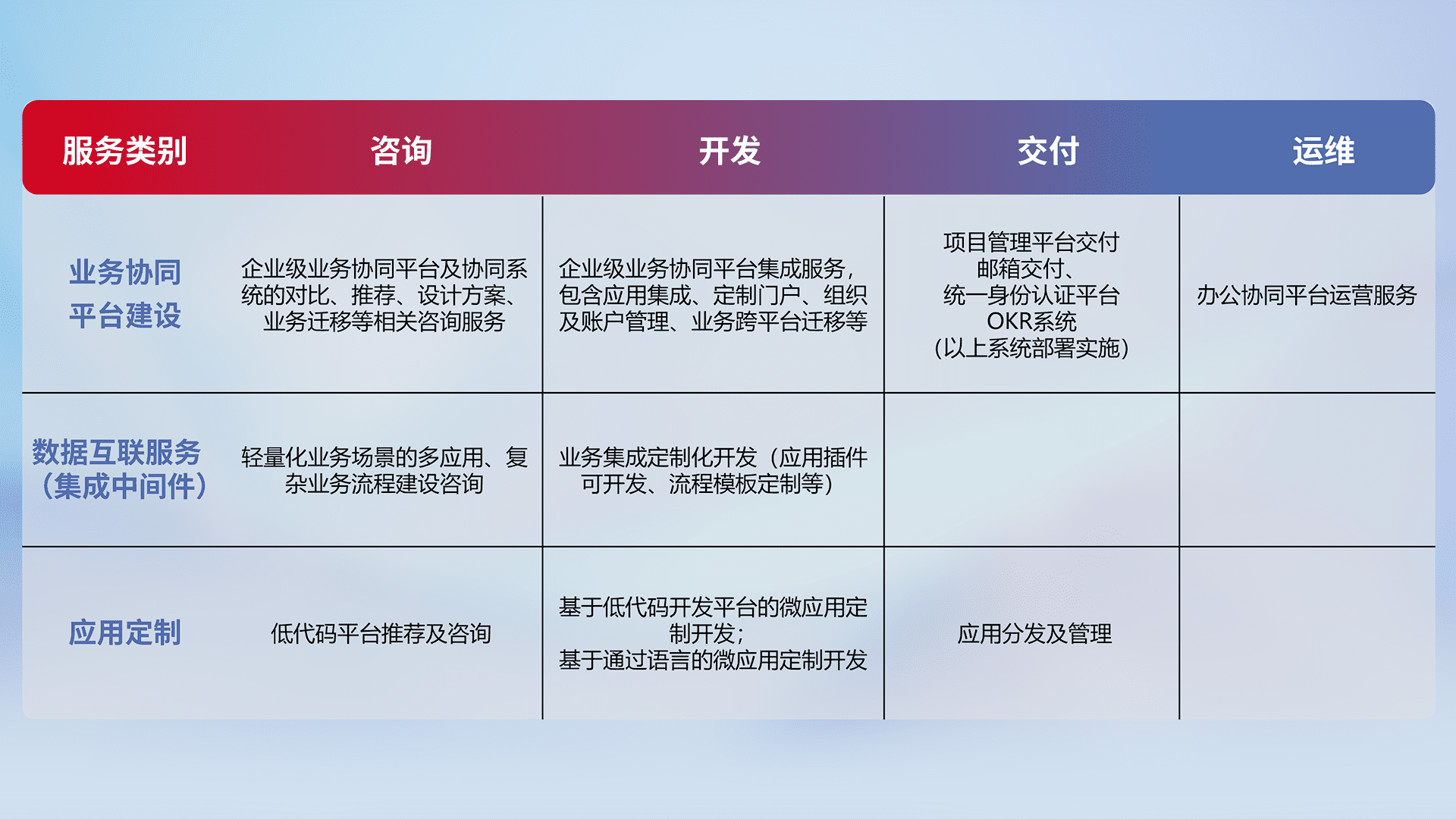 针对钉钉、、、、企微、、IDaas等平台级产品提供产品的规划、、方案、、、、交付、、定制化开发等服务,,,实现如统一协同办公、、、、智能客户服务、、混合会议管理、、、智能数据查询、、、、等业务场景,,,,实现数字化转型。。。。
